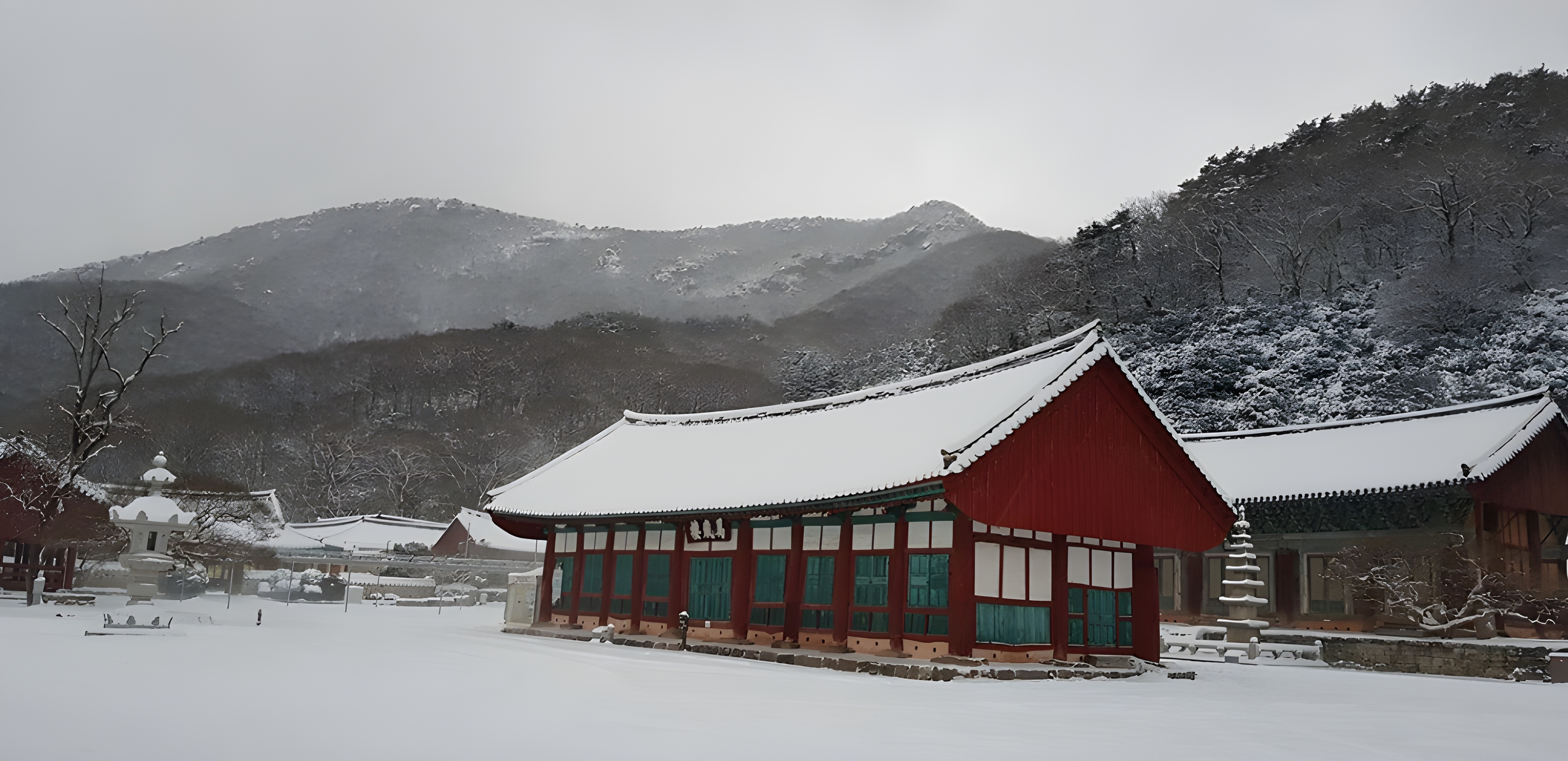 천년 역사를 품은 고찰답게, 그 고즈넉한 분위기가 정말 일품이에요. 12월 겨울에도 이곳의 아름다움은 여전하답니다. 특히 차밭의 푸른 기운과 눈이 소복이 덮인 설경이 어우러지면, 그 풍경이 얼마나 운치 있는지 몰라요.